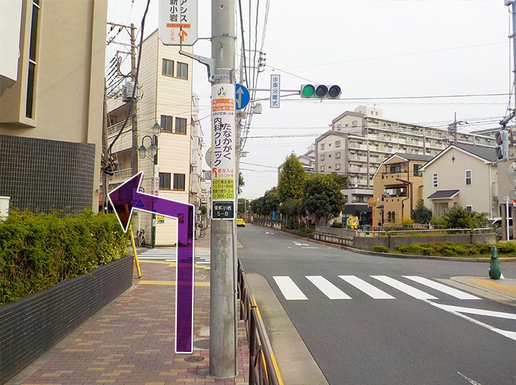 ②一つ目の信号を渡っていただき、右斜め前の道をお進みください。しばらく道なりに直進してください。